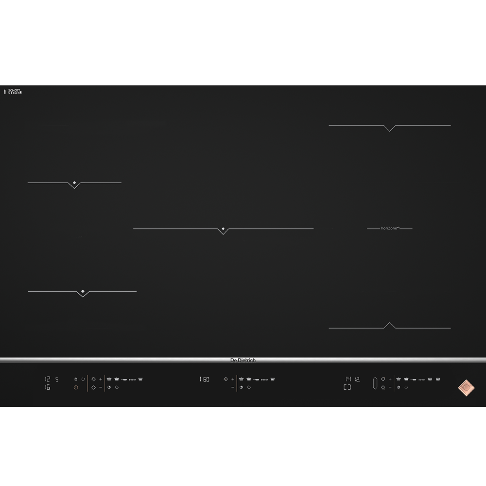 De Dietrich DPI7878X обладает пятью индукционными конфорками различного диаметра и мощности. Управление панелью осуществляется с помощью сенсорного экрана.